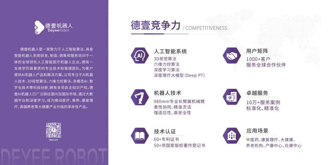 德壹机器人连续荣获央视报道,引领AI养老新浪潮!发表时间:2025-12-08 11:55 ![]() 养老新趋势 随着当前社会老龄化的加速,银发经济正迎来前所未有的发展机遇。最新数据显示,2022年我国60岁以上老年人口已达到2.8亿且逐年递增,预计到2030年这一数字将增至4亿。这一增长趋势不仅预示着老年人口数量的显著增加,也预示着对养老服务需求的急剧上升。2025年我国康复理疗市场规模预计将达到2686亿元,其中老年康复理疗版块预计将占403亿元,养生理疗则高达1500亿元。 在这样的背景下,智慧化转型养老产业成为了解决传统养老模式供不应求问题的关键!德壹机器人凭借其AI机器人创新技术与传统理疗技术的完美融合,在养老市场中脱颖而出,成为智慧养老领域备受瞩目的"实用新宠"。 ![]() 落地养老机构,开启AI化养老新模式 目前,德壹机器人的AI理疗机器人已在多家养老机构成功实施推广。通过高精度的3D视觉算法、六维力控算法与中医AI辨证技术等多项技术结合,德壹机器人能够精准识别人体轮廓、穴位,为老年人提供高效精准、个性化定制的AI理疗方案。这不仅提升了养老服务的质量和效率,也为养老机构解决了服务人力紧张的问题,开启了AI化养老的新模式。 《中央人民广播电视总台-大湾区之声》报道德壹机器人 艾灸老中医(德壹艾灸机器人)入驻养老机构,获得老年人“这个机器人发明的非常好”一致好评!解决传统艾灸理疗过程中:艾烟大、环境差、易烫伤、不精准等等问题。为老年人提供安心高效的艾灸理疗,为工作人员减少劳动强度。 《CCTV2-经济信息联播》报道德壹机器人 技术和成本问题一直是养老机器人落地推广的**挑战。德壹机器人多年深耕AI理疗版块,已超越行业平均水平,实现大规模生产、标准化出厂并不断攻克价格难题,推动AI理疗机器人更快落地到千家万户。 德壹机器人获养老产业市场认可的原因 (一)技术创新与专业优势 德壹机器人在 3D 视觉算法、六维力控算法、人体穴位智能识别、中医AI辨证技术等方面掌握核心技术。这些技术的融合应用,使得德壹机器人在性能和功能上都具有显著的优势。例如, AI 理疗机器人能够精准地识别穴位,最快响应时间内为老人提供既保证个性化、又保证标准化的理疗过程,这在传统的人工理疗中是难以实现的。 ![]()